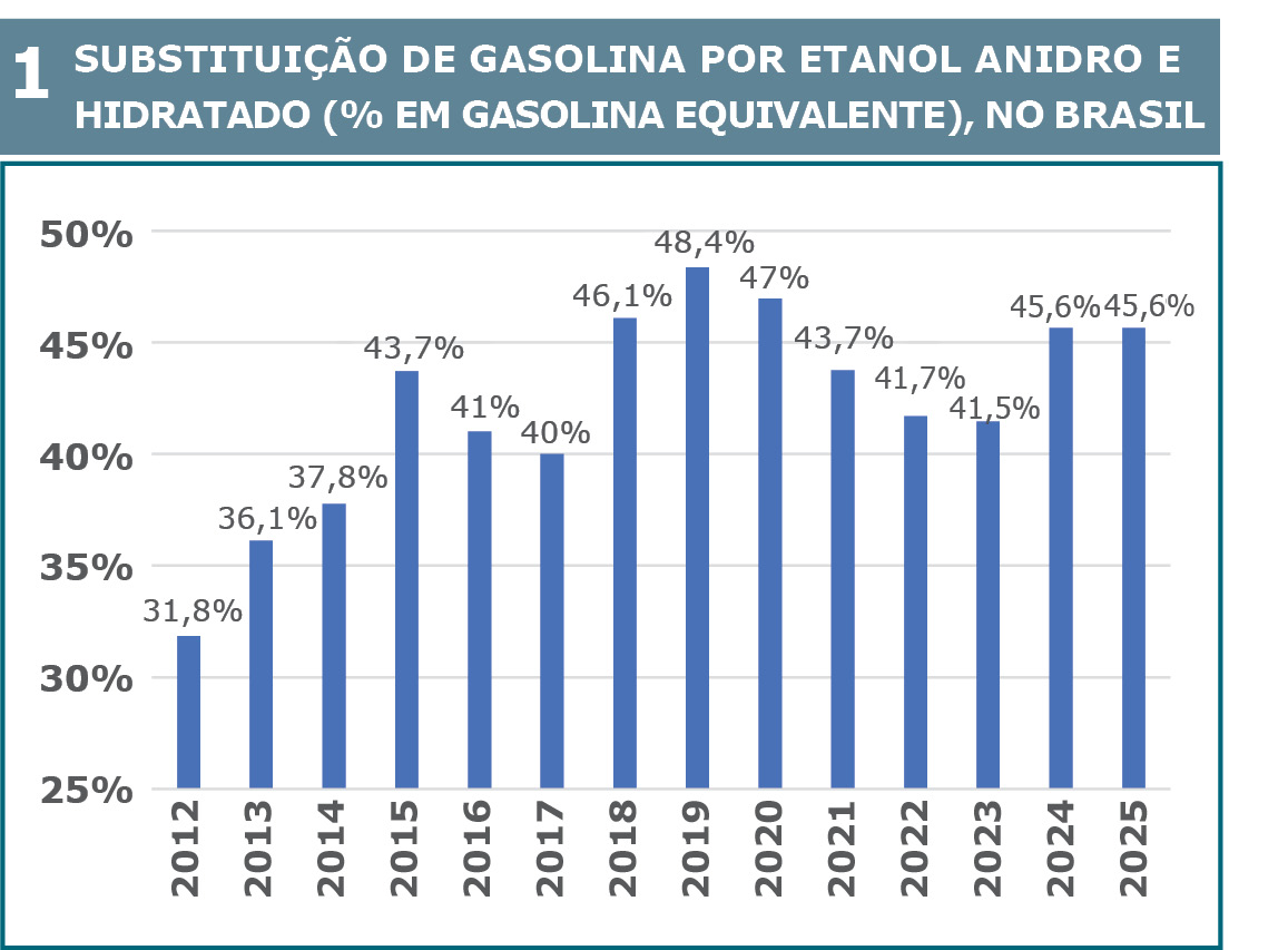 Ao longo do tempo, e superando vários obstáculos e com resiliência, em 2025 o setor sucroenergético brasileiro manteve a marca de 45,6%, percentual que já chegou a 48,4% em 2019. (veja figura 1)