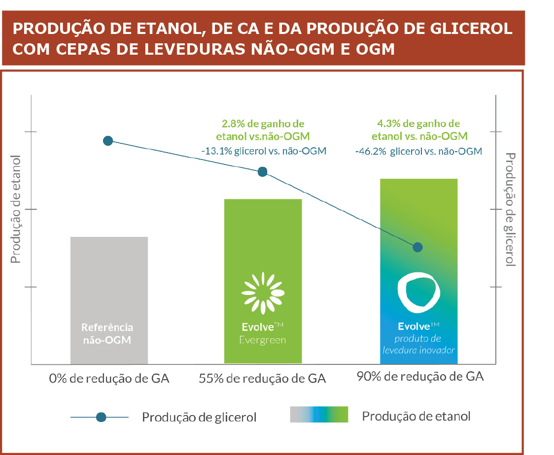 Os avanços em leveduras geneticamente modificadas (OGM) revolucionam a produção de etanol com ganhos notáveis de eficiência e rentabilidade. A ilustração em destaque mostra de forma resumida os principais resultados e benefícios com a adoção de leveduras de alto desempenho, como as linhagens OGM.
