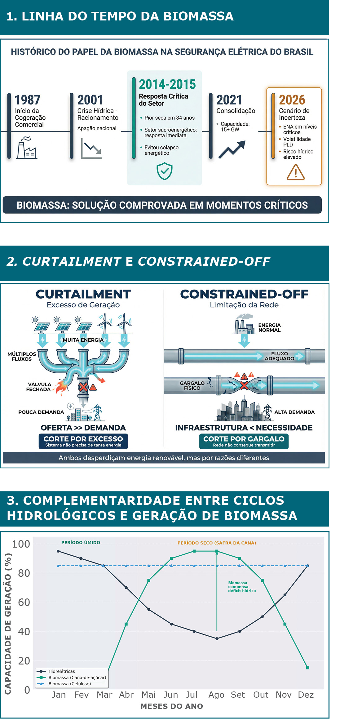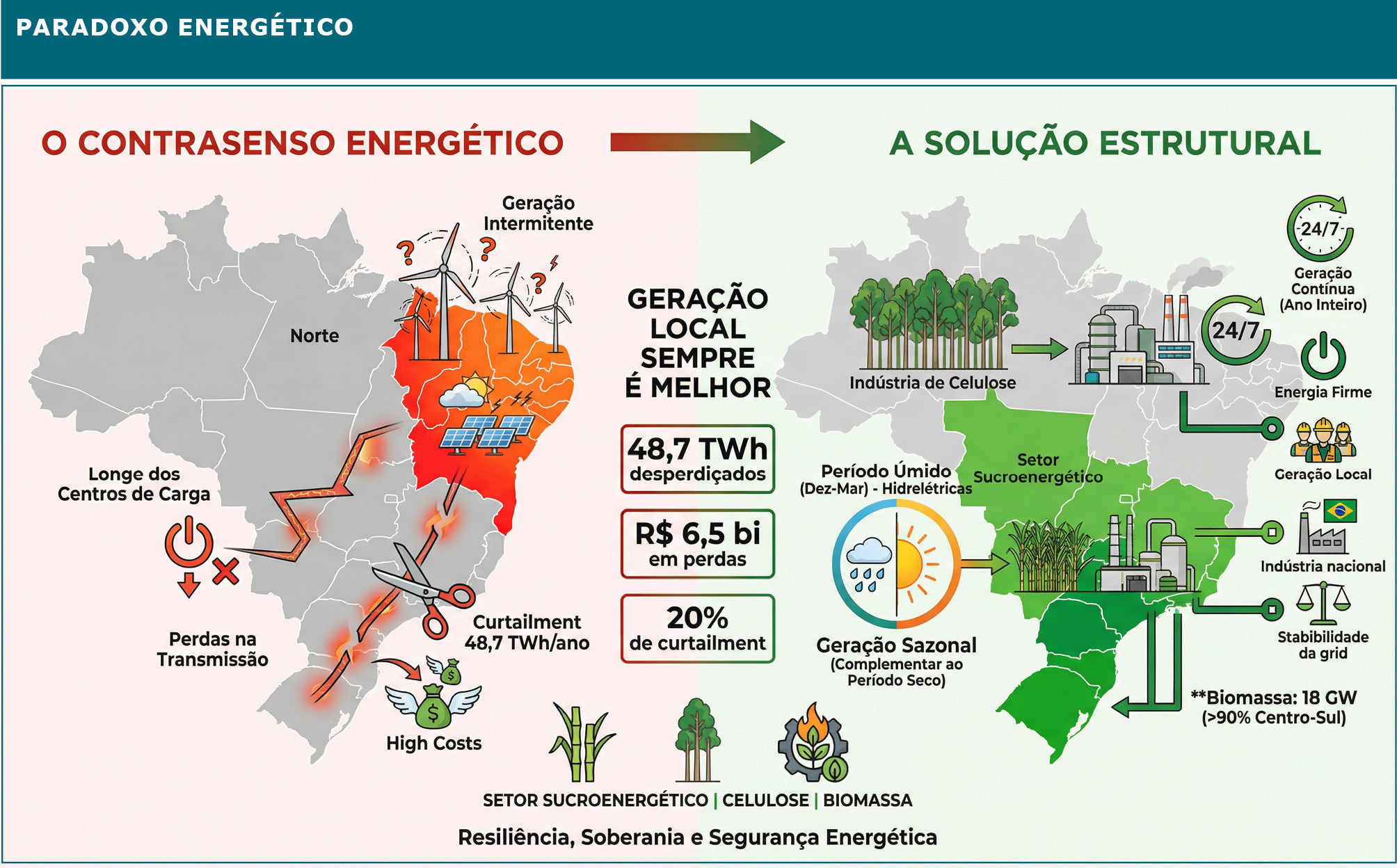 Nessas situações, o risco não é apenas o desperdício de energia, mas potenciais desligamentos programados de usinas de biomassa, reduzindo a inércia síncrona disponível exatamente quando o sistema está mais frágil.